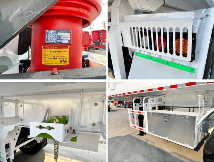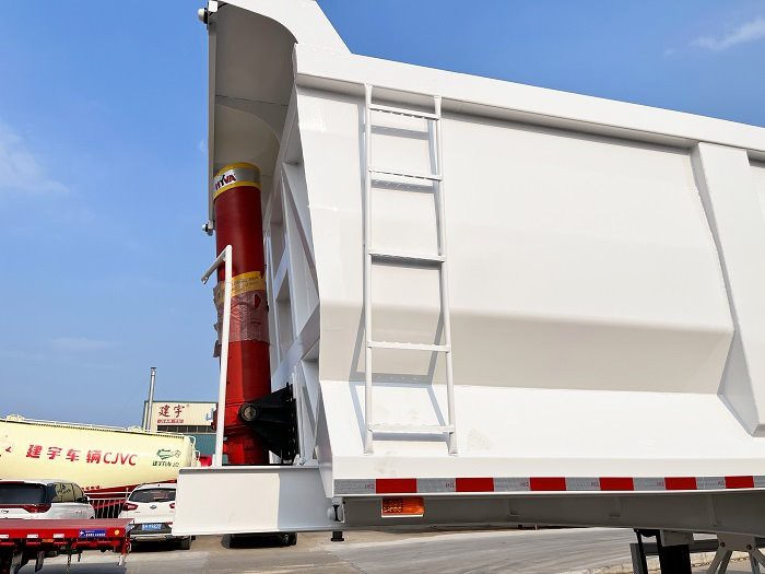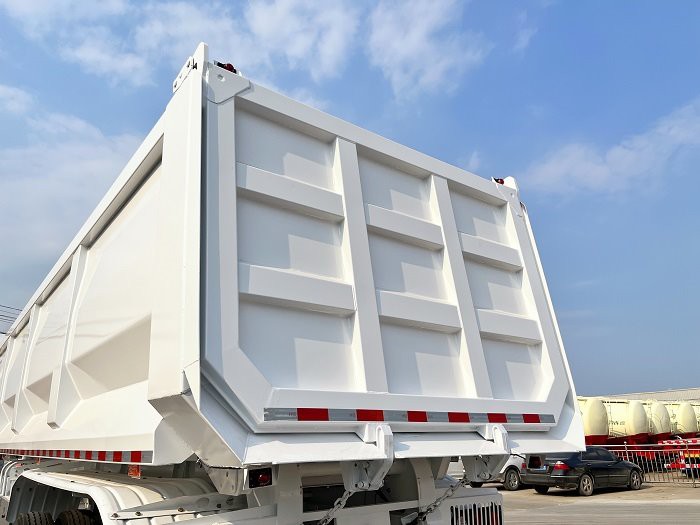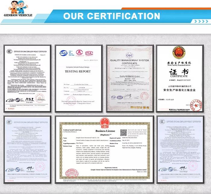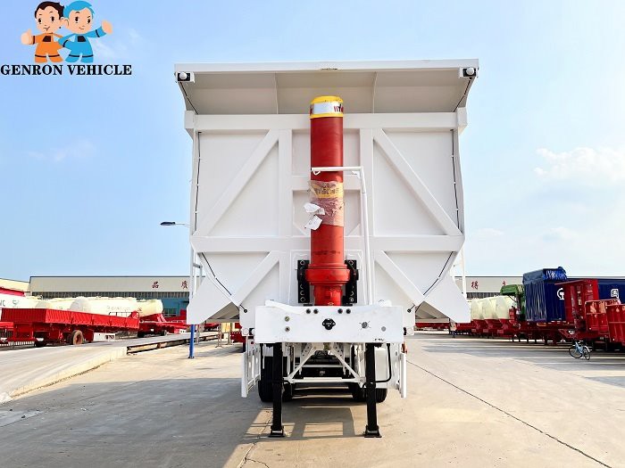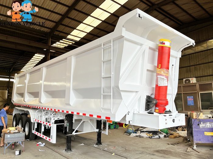 GENRON TIPPER (DUMP) SEMI TRAILER DESCRIPTION: ①Tipping bucket size,shape,box thickness, HYVA hydraulic cylinder and optional fitting (two pieces spare tire carriers, water tank, fuel tank, etc.) ,all can be customized. ② GENRON tipper (dump) semi trailer can be designed separately according to the different needs of customers, or tell us that the medium of the goods you carry is different, and we will design the corresponding models for you to meet the individual needs of customers.